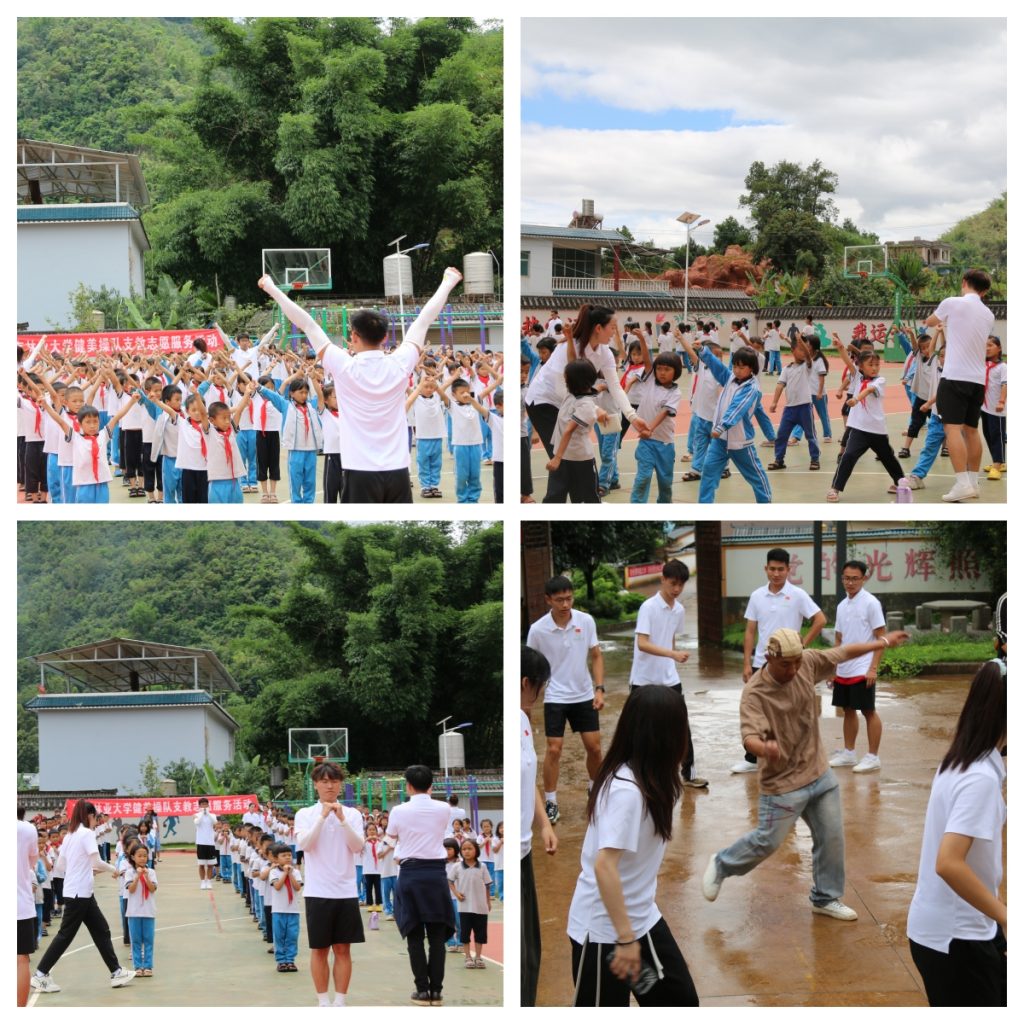 健美操支教队在赵化斌副教授的带领下,学习当地特色歌谣,将少数民族民歌《阿数瑟》、当地少数民族“打跳”和啦啦操相融合,创作“打跳”啦啦操。武术支教队在云南省武术冠军郑洁莹老师的带领下,为当地少数民族小员工教授和表演传统武术。为传承弘扬中华优秀传统文化,增强中华民族命运共同体意识,用艺术的形式,创作出更新更好的作品来讲好中华民族共同体故事。社会实践队在团委负责人艾陟邦老师的带领下实地走访调研德昂族村寨、南伞镇刺树丫口戍边馆、边境联防所、边界碑,体验民族文化特色、召开民族团结座谈会、组织开展“党史学习+定向”活动。